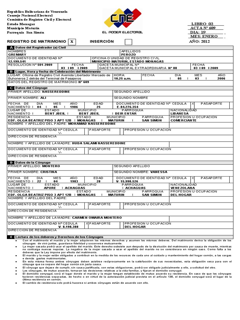 Acta Matrimonio Cne PDF Esposa Certificado de nacimiento